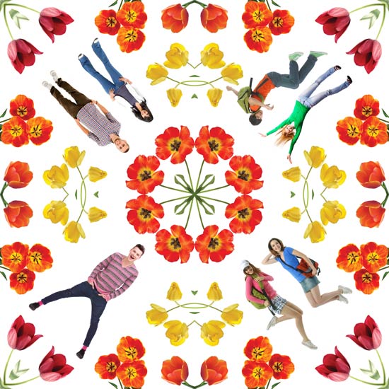 Возникла идея калейдоскопа. Образ многообразный (калейдоскоп всегда меняется). Образ современный (яркий принт). Поп-артовские приемы работы с образами. Легко существует в масштабе супер графики и мелкого патерна.