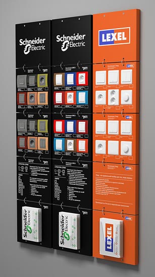 Наиболее важным в продвижении являлось создание мобильной, легко изменяемой системы для выкладки, которая состоит из 5 (в максимальном варианте) модулей. Модули соединяются между собой cоединительными металлическими кольцами и вешаются за верхние отверстия основного модуля на стену в ряд один за другим.