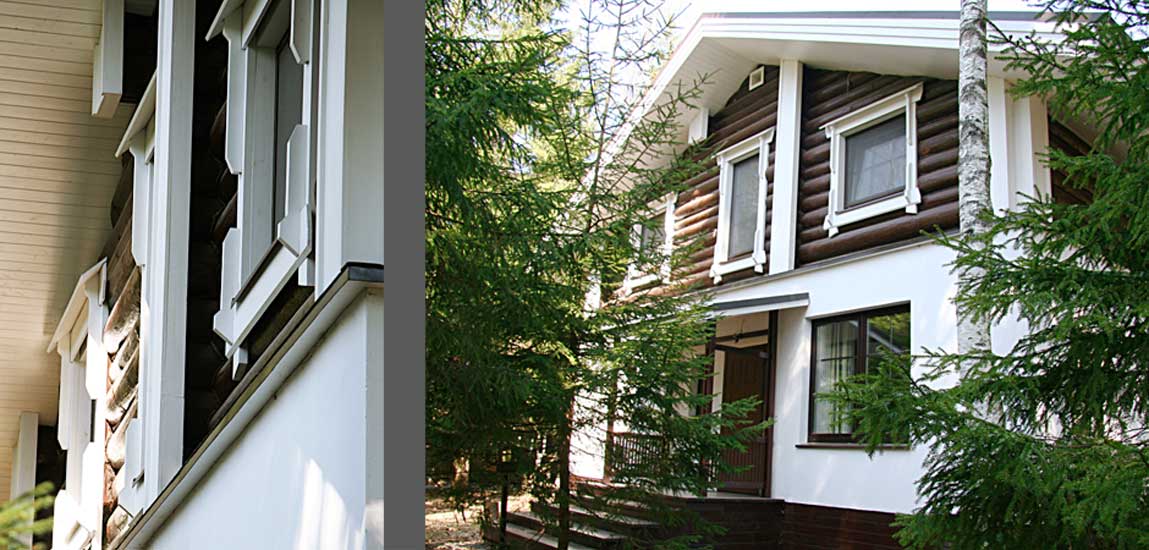 Нижняя часть дома каменная, второй этаж - сруб, снаружи покрашенный в темный шоколад, а внутри - прозрачной белой морилкой. Двухскатная крыша с большими свесами. Есть такая фраза: «Если кровли больше чем стен, то это шале». Именно так. Хотелось сделать «русское шале».