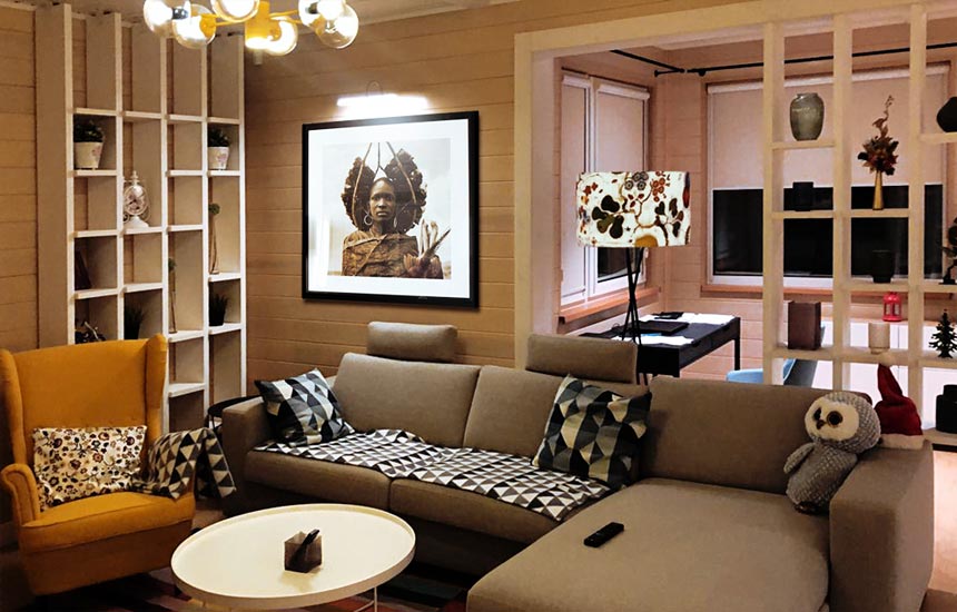 Заказчик купил уже готовый дом для семьи. Но интерьер остался из 90-х. Накладные балки с чеканкой, вагонка, темная мебель кухни и пузатые диваны.