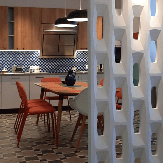 Большая четырехкомнатная квартира в сталинском доме 50-х годов превратилась в единый объем, включающий кухню, столовую, гостиную и кабинет. Объем получился длинным и требовал зонирования. Сначала гипсовая перегородка отделила кухню/столовую от гостиной, а штора мобильно зонирует кабинет.