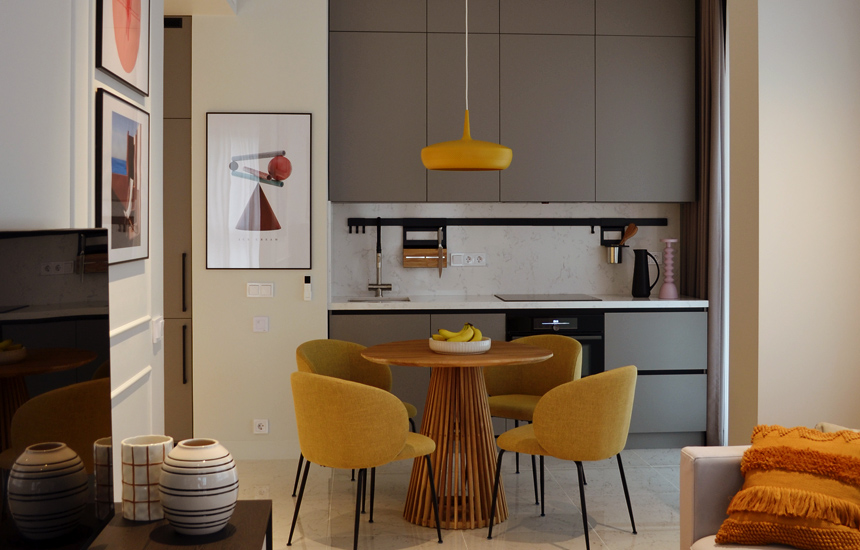 Как-то сразу появилась идея сделать полностью серую кухню, одним блоком со шкафами прихожей. Лаконичную и без деталей. Достаточно нейтральная цветовая гамма дополнена желто-горчичными оттенками декора и клубнично-розовым смузи шкафа в спальне.