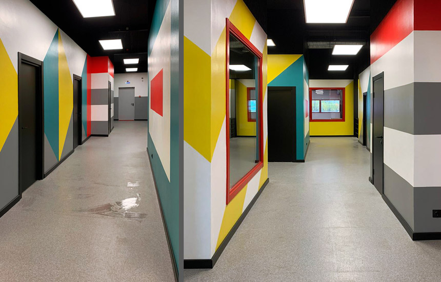 Обычный коридор стал более интересен с помощью выступающих объемов помещений. Активный коридор и спокойные кабинеты.