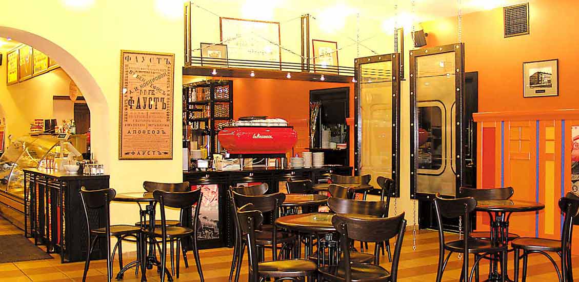 В этом пространстве не ставилась задача создать интерьер классической кофейни - здесь слишком много намешано для такого благородного продукта. Яркие насыщенные цвета, старые плакаты и афиши, стеклянные перегородки, отсылающие к старинным вагонам, металл, дерево.